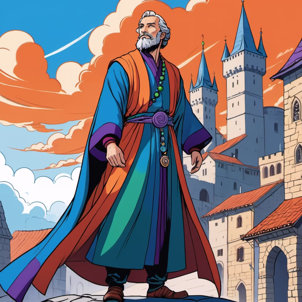 Prompt: Panoramic view upwards of medieval city, beautiful view of clear sky with few clouds, swirling sky of colors, in the center, dynamic pose bald wise man with a beard dressed in a robe and a black bead necklace, colors orange, indigo, violet, blue, green, red, fantasy lineart style