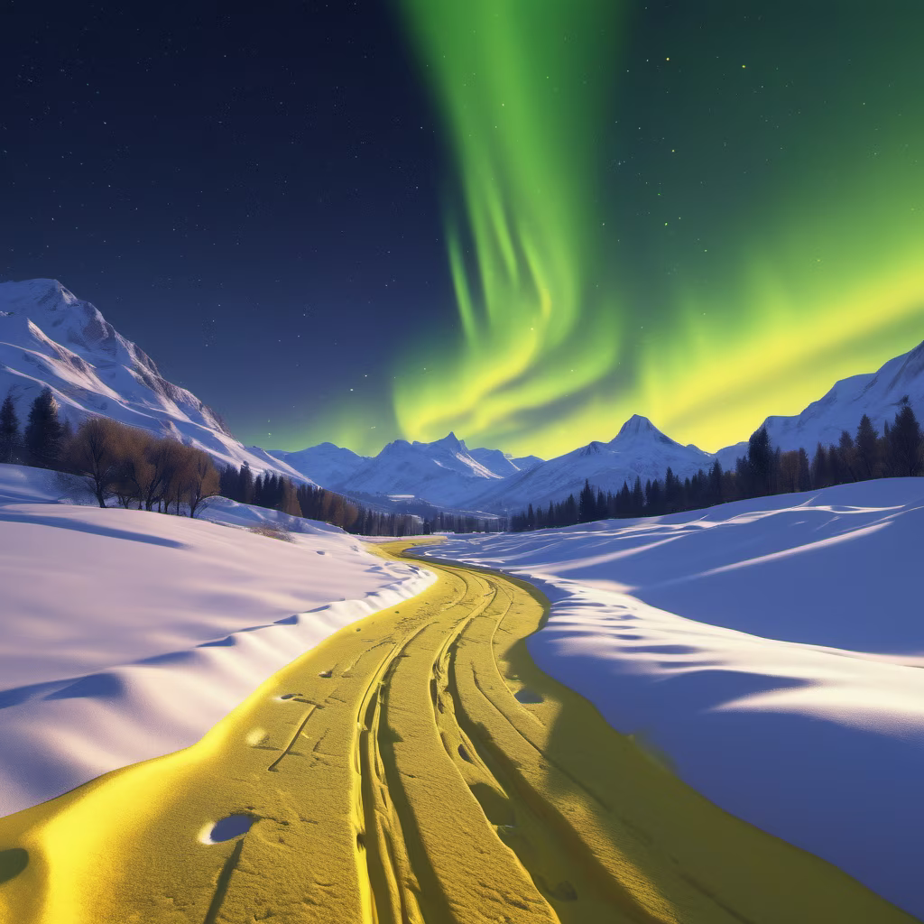 Prompt: Yellow Aurora in the yellow snow, snow mountains, roads covered with bright yellow snow, footprints and ruts in the snow on the way home, rivers, snowstorms, Bright night, village, starry sKy, and the Aurora shining in the sKy, Unreal Engine, a bright yellow filter, you can't imagine how beautiful it is. 4K HD, HD - v 6