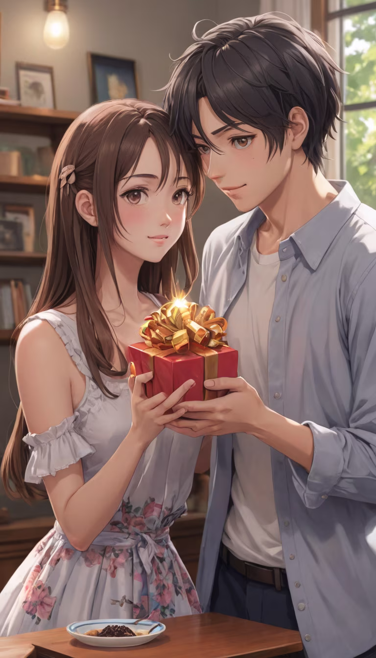 Prompt: The guy giving an unexpected gift to his girl, symbolizing care and attention, surprising and sweet.