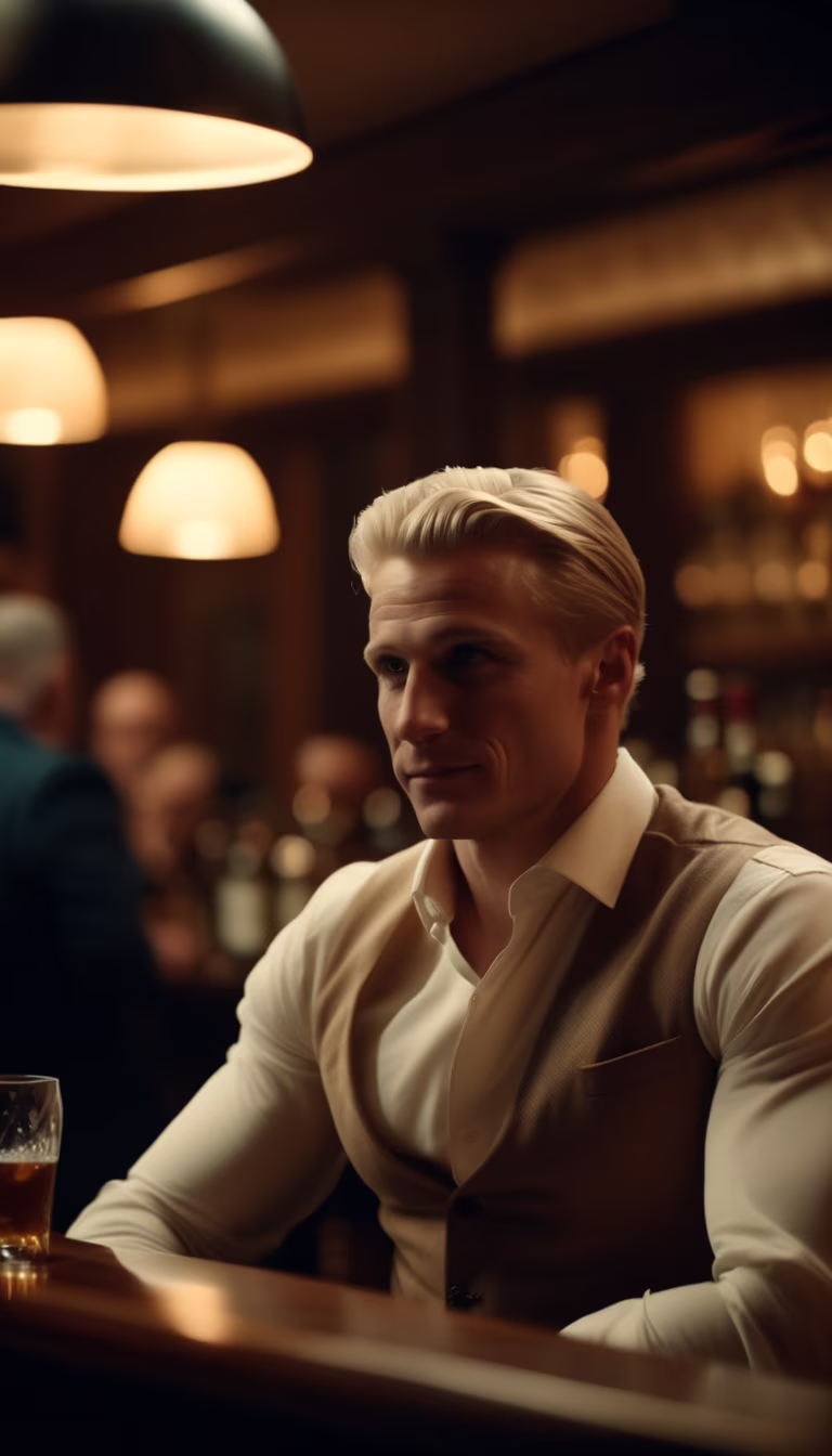 Prompt: A blond man in a bar, looking at another man with fascination and desire;4k; realistic , intricate details