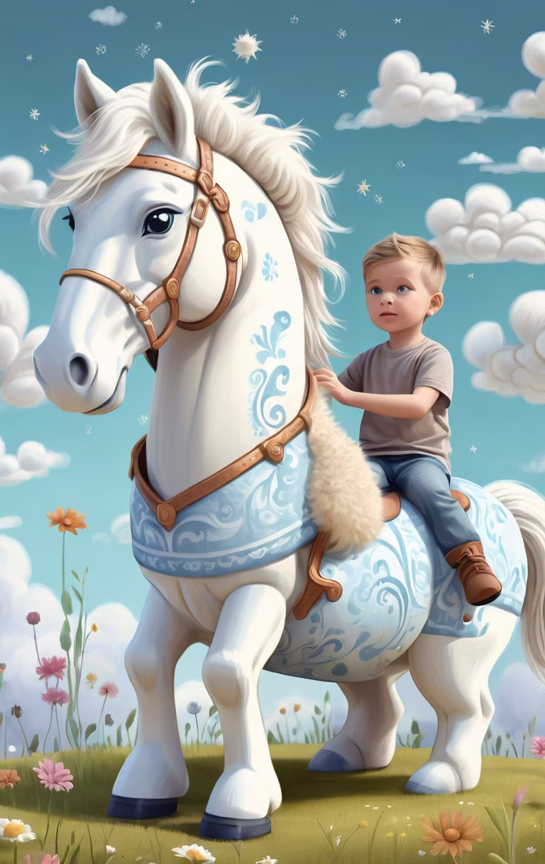 Prompt: a girl and a boy in front sit together on a fluffy magical toy horse in the middle of a magical field. The boy is three years old. The girl is three years old. Plush white horse with patterns. Clouds in the sky. Cartoon hand drawn style.