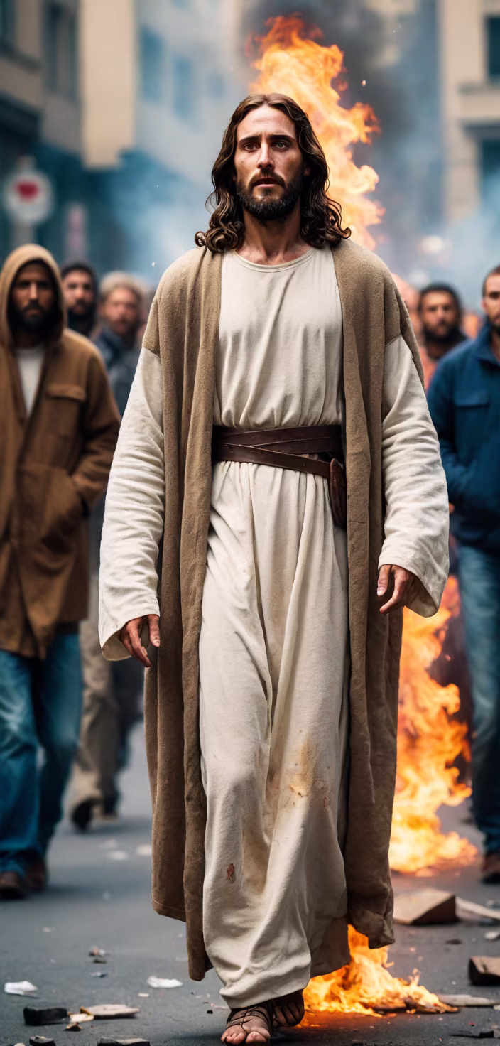 Prompt: a sad jesus christ, stand in the middle of a riot protest, fire buildings, anger people running, destruction, war