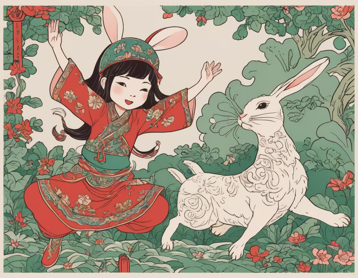 Prompt: A traditional Chinese girl with a rabbit hat on her head and a lovely huge dancing rabbit behind her,flat cartoon,woodblock print style,flat illustration,vector illustration,soft color palette,bold lines,mixed patterns,full body,doodle in the style of keith harling,reditional chinese printmaking,red and green color scheme,white background,full body