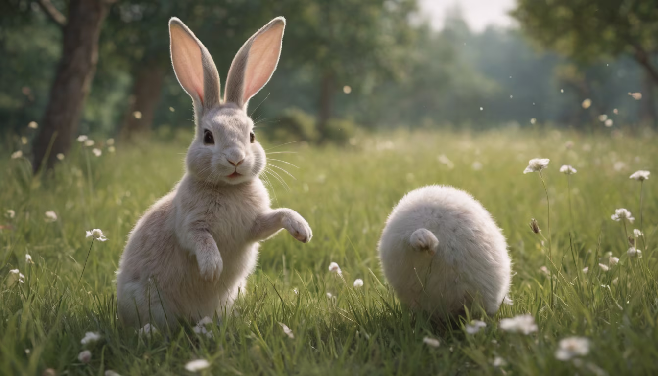 Prompt: A gorgeous cartoon rabbit on the grass, with a gorgeous background
