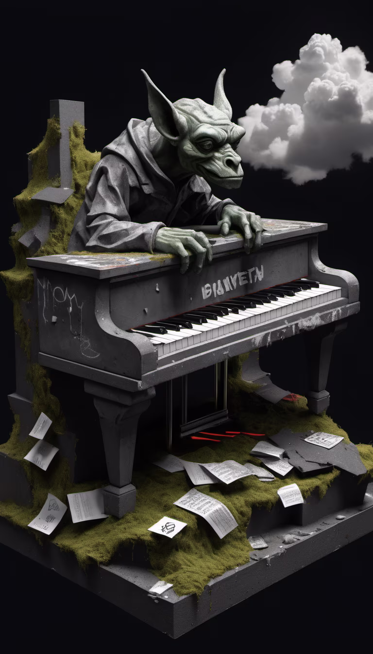 Prompt: A mini 3D floating isometric model Brutalist architecture mossy cement gargoyle on piano adorned covered with graffiti texts and torn posters on the walls , in clouds, Oil painting, Impressionism, stroke, moody,dimly dark,sci-fi concept art,highly detailed, beautiful scenery,architecture,64k, high resolution, black background