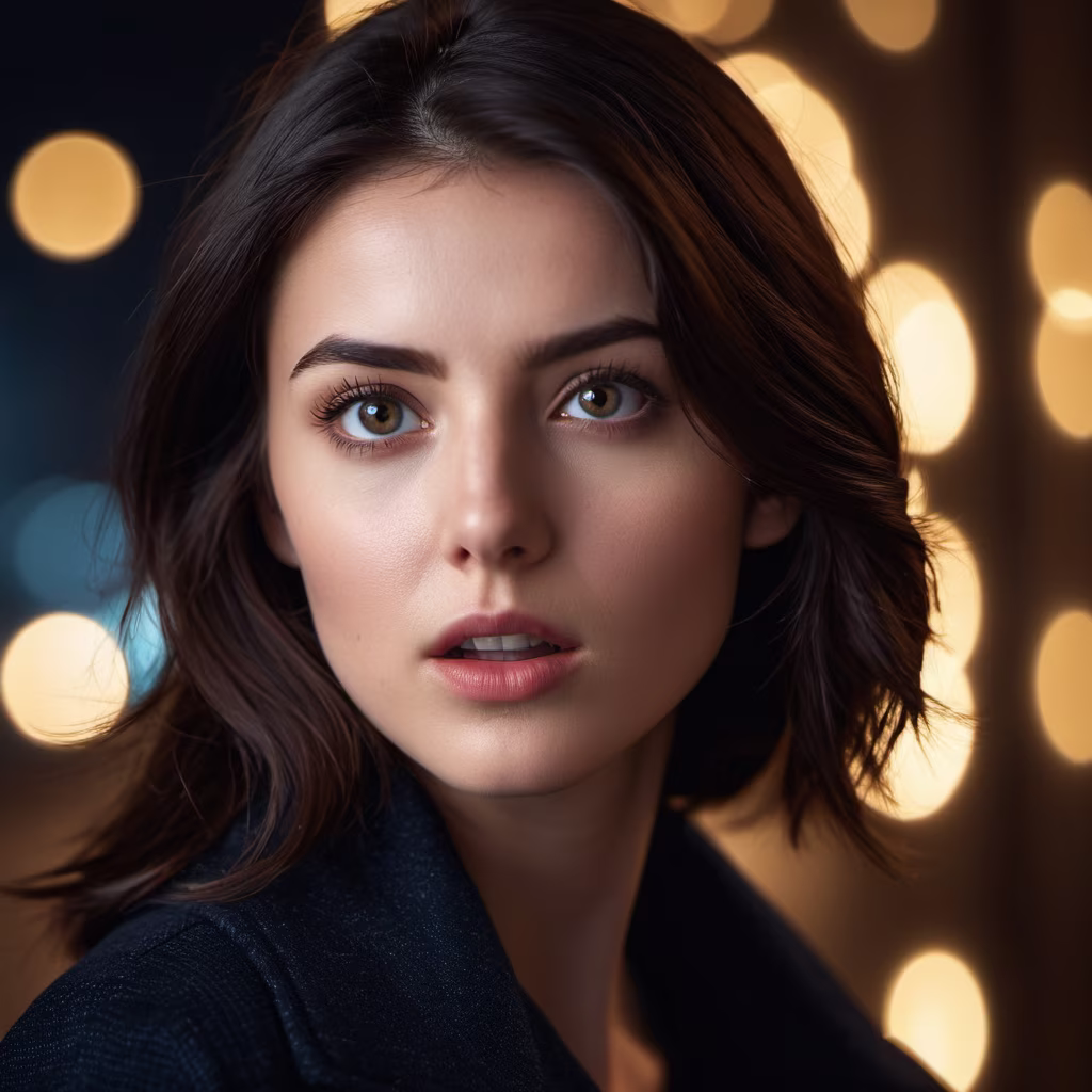 Prompt: Face focus, masterpiece, best quality, portrait of a young woman, dark hair, frightened face, wide open eyes, parted lips, сontour light, directional light from the side
