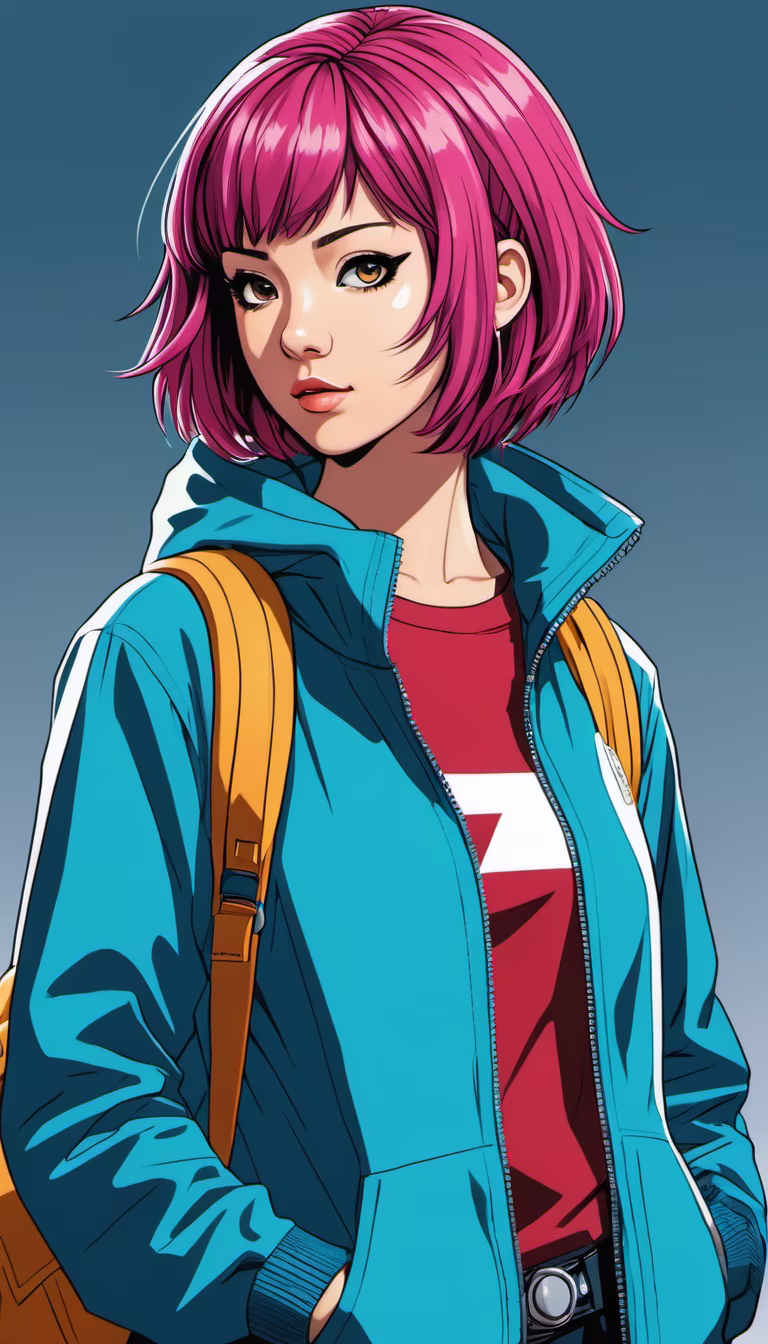 Prompt: Create a new variation of a young woman in the ((style of Brian Lee O'Malley's \"Scott Pilgrim\" comics mixed with Jujutsu Kaisen Manga style:1.3)), adding a subtly sexy element to her appearance. She should have a vibrant ombre hairstyle with random colors, transitioning from her natural hair color, styled in a futuristic and trendy manner. Her expression and pose should convey confidence and a bit of allure, while still fitting within the youthful and energetic aesthetic of the comic series. The illustration should have bold, clean lines with a minimalistic background, emphasizing her unique hairstyle and stylish, ((slightly seductive demeanor:1.2)).