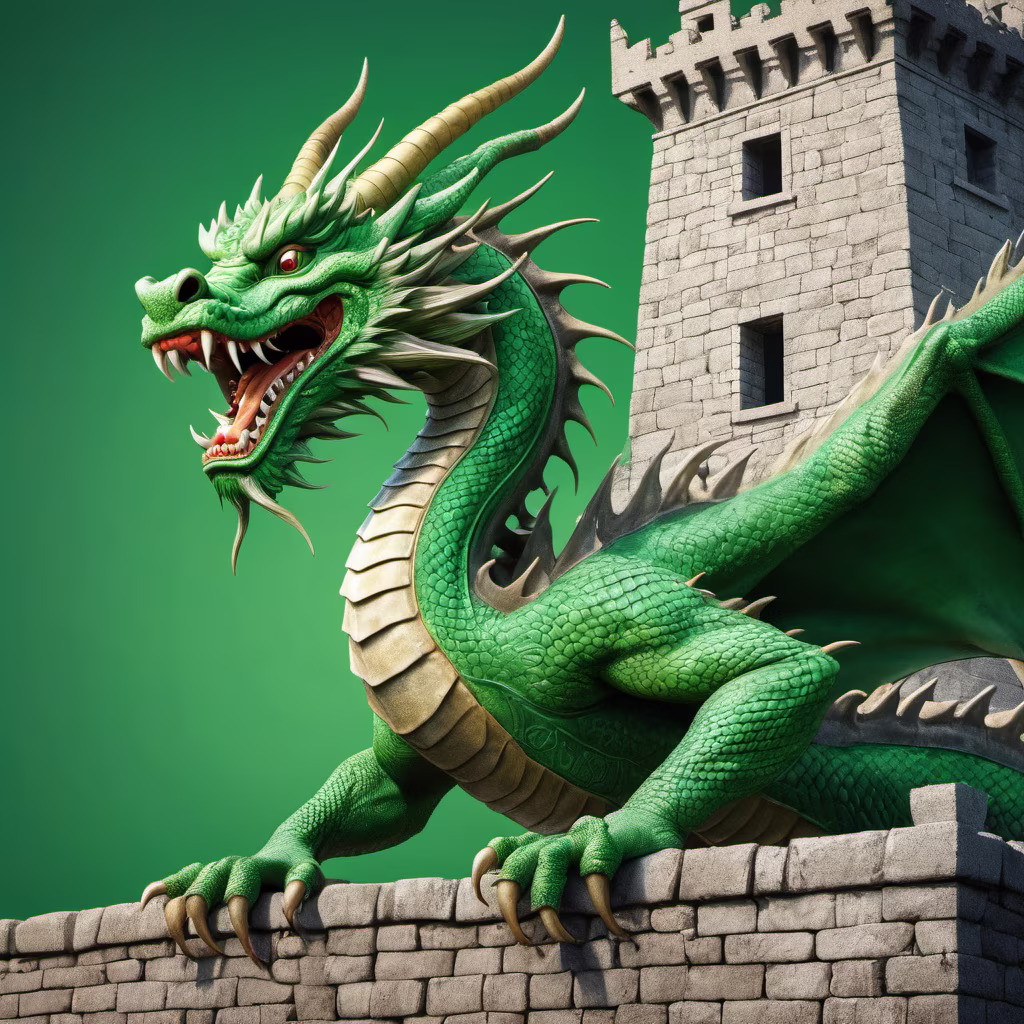 Prompt: A Chinese ancient dragon, with two claws, clings to the castle wall, peering directly into the inner fortress, with green screen behind, front view, realistic, vivid, details