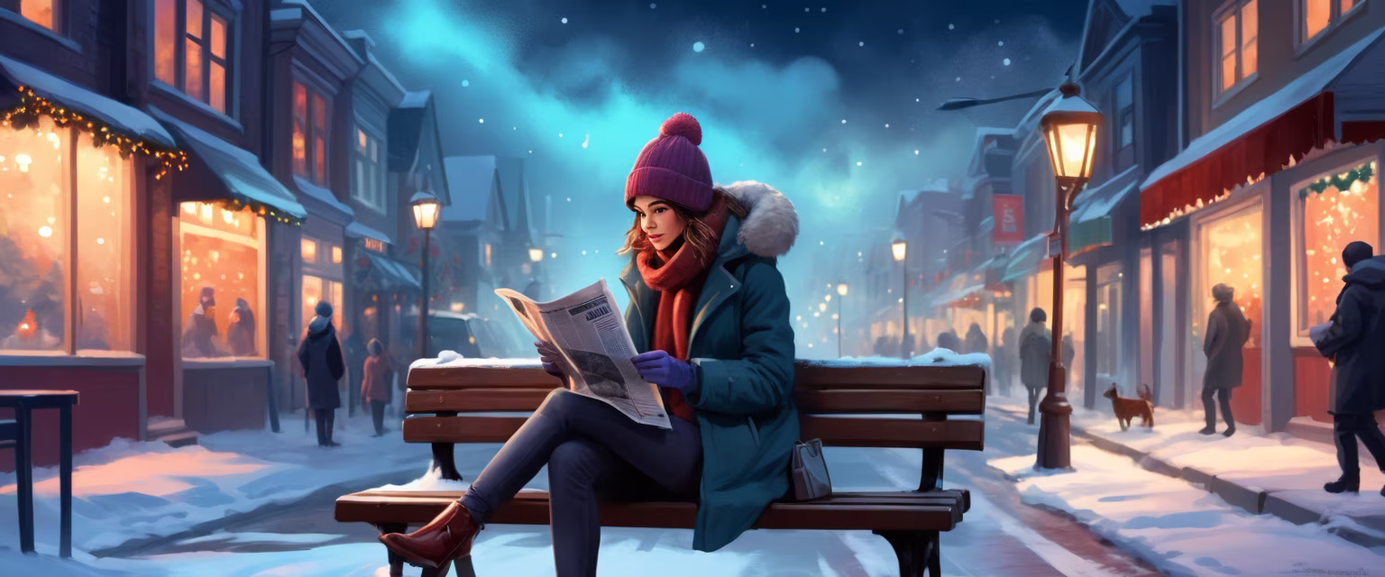 Prompt: a chilly canadian steet in december, woman in winter clothes on a bench, reading a newspaper, breath fogging up, christmas decorations on the shops in the background, night sky above, cool colors, calming vibe