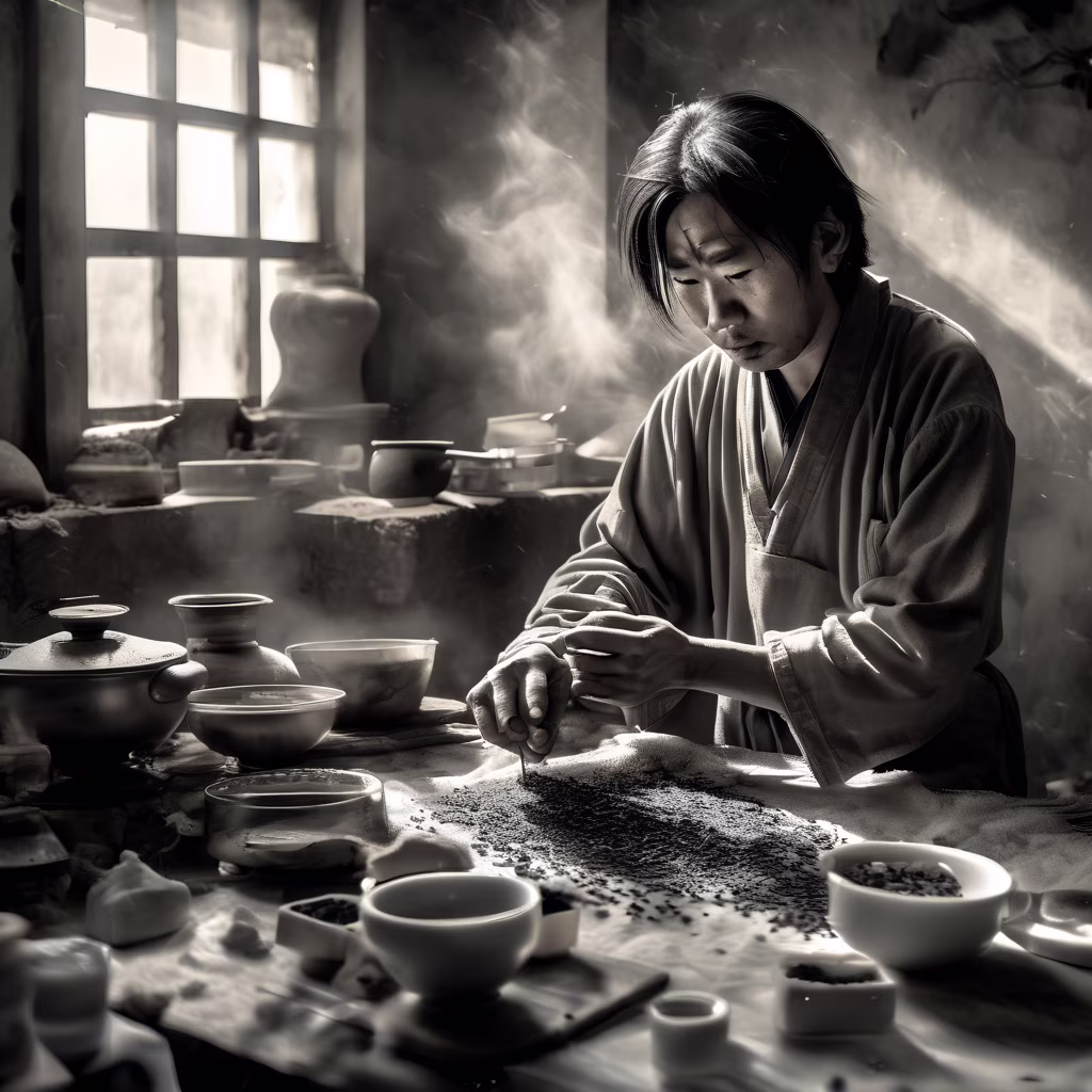 Prompt: Extract raw materials from images. Create a photographic work, a bright and warm modern tea processing workshop, a Chinese master is making tea, 16:9, natural sunlight, backlighting, a beam of sunlight shines on the master's hands. #negative hint disfigurement, sketch, painting, (worst quality: 2), (low quality: 2), (normal quality: 2), low resolution, normal quality, ((monochrome)), ((grayscale) )), Skin spots, acne, skin blemishes, poor anatomy, (long hair: 1.4), (fat: 1.2), low resolution, missing fingers, missing arms, missing legs, extra digits, extra arms, extra legs, Extra feet, ugly, disfigured face, deformed face, extra legs, misshapen limbs, fused fingers, too many fingers, long neck, cross-eyed,