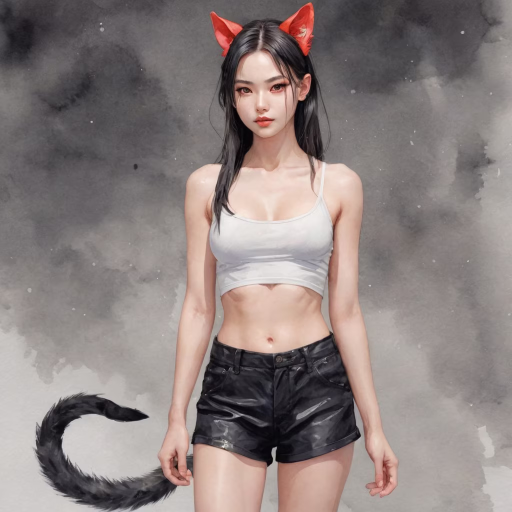 Prompt: A full-length picture, without a background. She is athletic, slim, fit, fit, clean and very muscular, with a slim waist and narrow hips. She has white skin and flowing shiny hair. Her large, lively, glowing red Asian eyes seductively gaze at the viewer with predatory, otherworldly charm. There are beautiful cat ears on the head and there is a tail. Dressed in black shorts, with a T-shirt