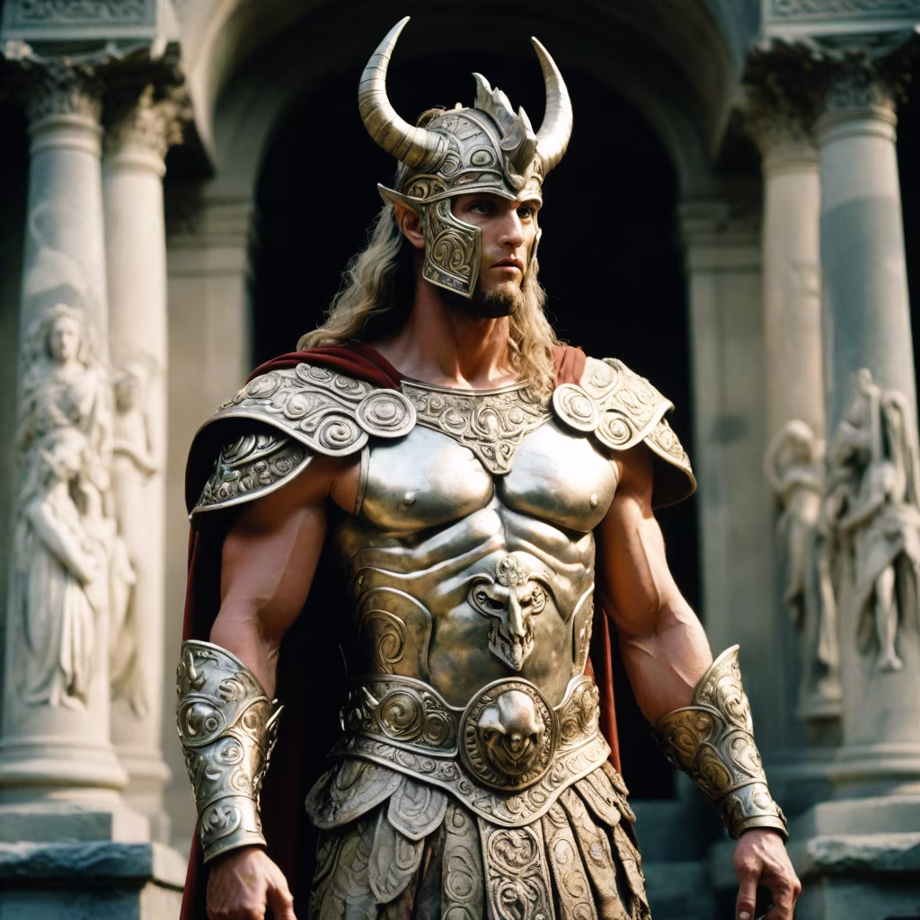 Prompt: .Ancient Transformation in a Mythical Realm: Imagine a scene where a powerful, heroic character, akin to ancient mythological heroes, undergoes a transformation in a mythical realm. This character's physique, echoing the strength of legendary warriors, blends seamlessly with elements of ancient myth and legend. The backdrop is a grand, ancient landscape, filled with timeless architecture and mythical creatures. The character's attire is regal and symbolic, befitting a figure of myth and legend. The artistic style should emulate classic frescoes or tapestries, rich in detail and history.