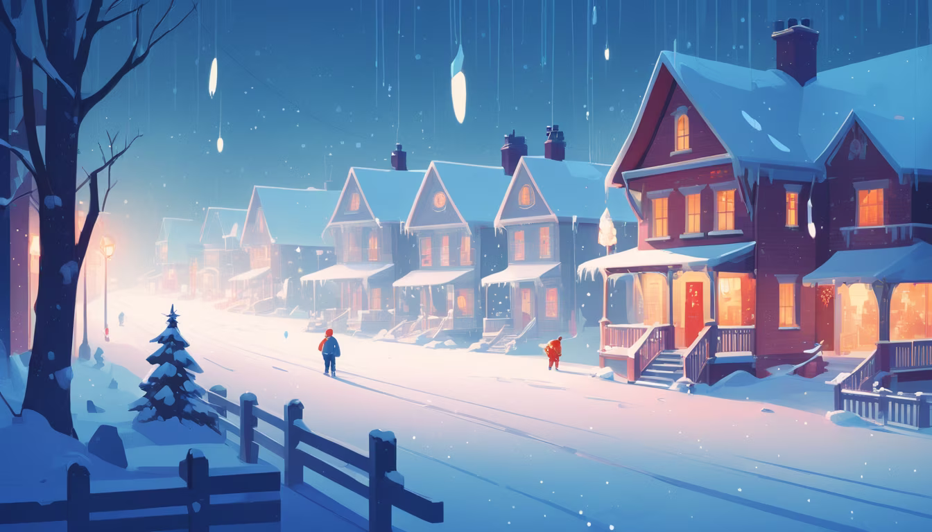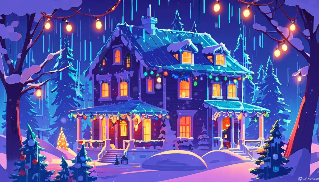 Prompt: a painting of snow blizzard :: a storybook illustration by James Gilleard, behance contest winner, 2d game art, storybook illustration, rich color palette, blizzard:1.5 christmas:2 blizzard:1.5 cold winter:1.5 christams decorations, christmas lights