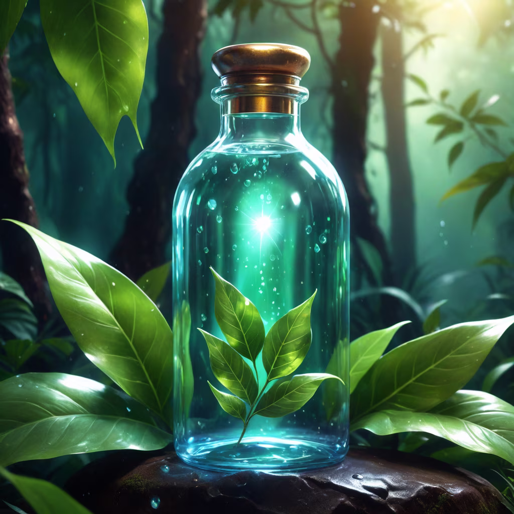 Prompt: A product, bottle, modern streamlined bottle shape, placed in the jungle, c4d, light effect, advanced, light refraction, surrounded by green leaves, smoke decoration, water droplets, distant view atmosphere, dark background, sunlight shines on the water droplets with a faint glow Light
