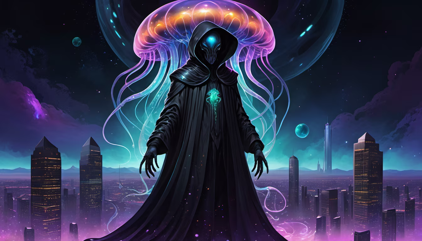 Prompt: A full body view of an ominous and foreboding black translucent jellyfish alien, wearing black flowing celestial robes, magic flowing out from its fractal tentacles, a futuristic city in the background, floating amongst an iridescent nebula