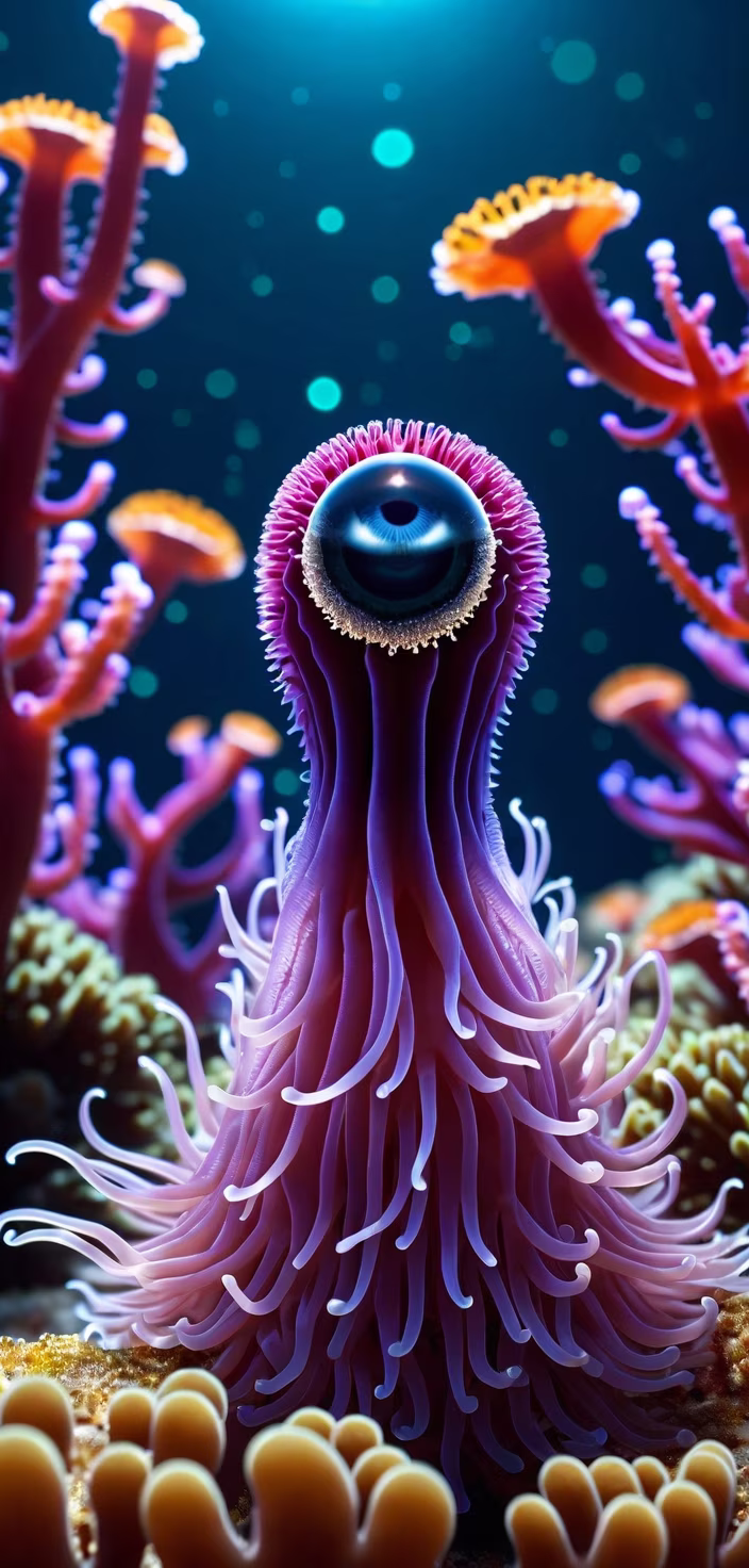 Prompt: An alien planet with a sea anemone, in front of it is sea cucumber with one giant eye on its tip.
