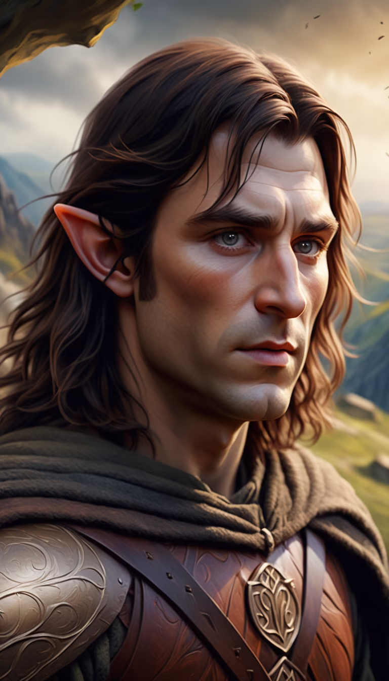 Prompt: An ultra-realistic painting inspired by the Middle Earth universe. A 30 year old man. formed oval face and an elongated nose. dark brown hair. A guardian. at the top of a plain. full body. (best quality) +, (complex details) +, (16k UHD), stylized with bold brushstrokes and vivid colors, atmospheric lighting, ultra detailed, photorealistic, photorealism.