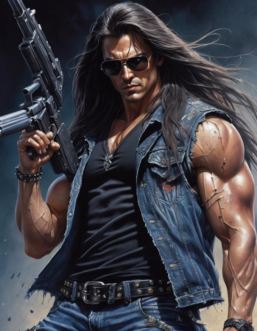Prompt: live-action, detailed, sunglasses, happy, long dark hair Man warrior with big gun, long hair, jeans vest, black tshirt, rivets, in action movie poster , royo art, full body.