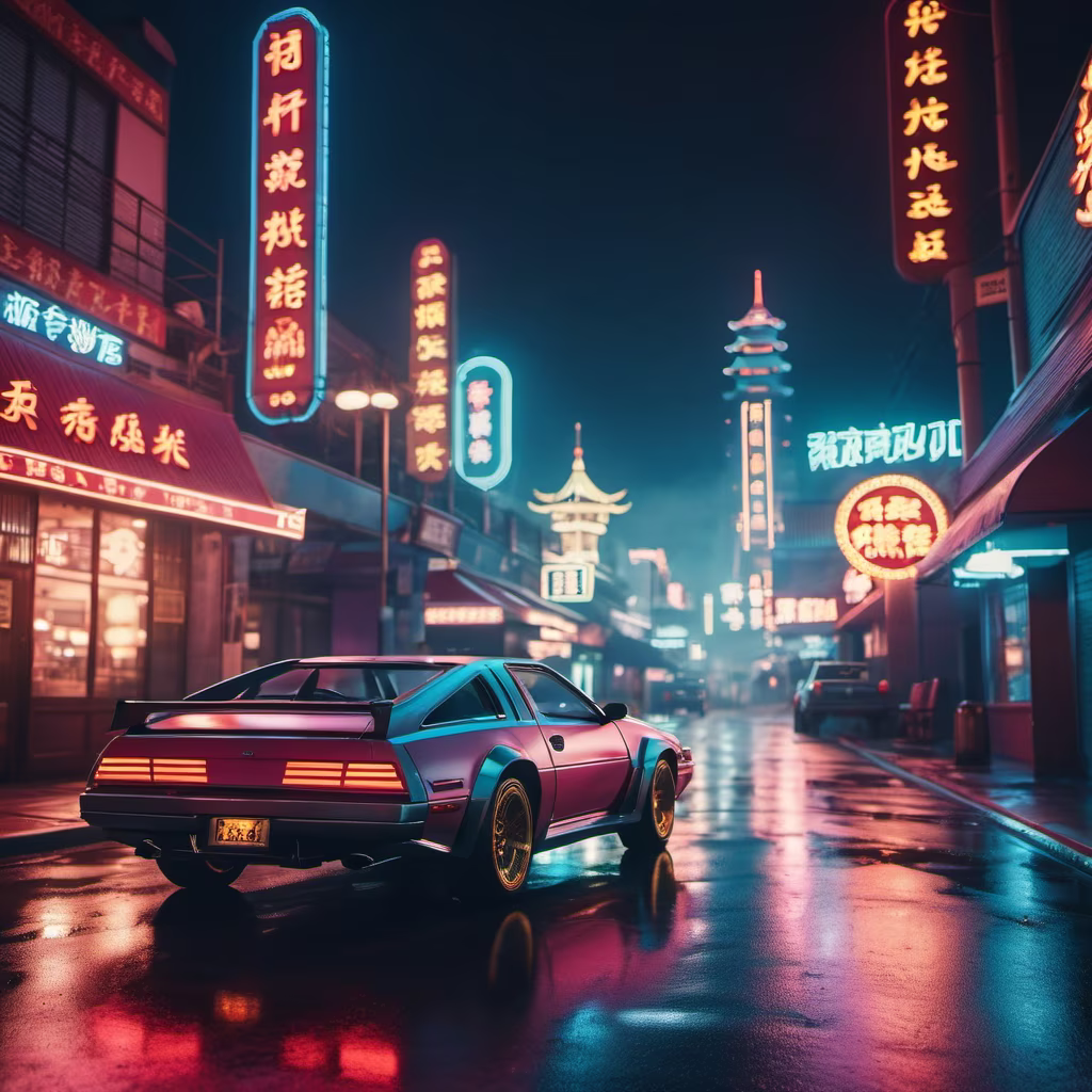 Prompt: A super cool sports car is parked on the wet street just after the rain, with neon lights flickering in the background from tall buildings