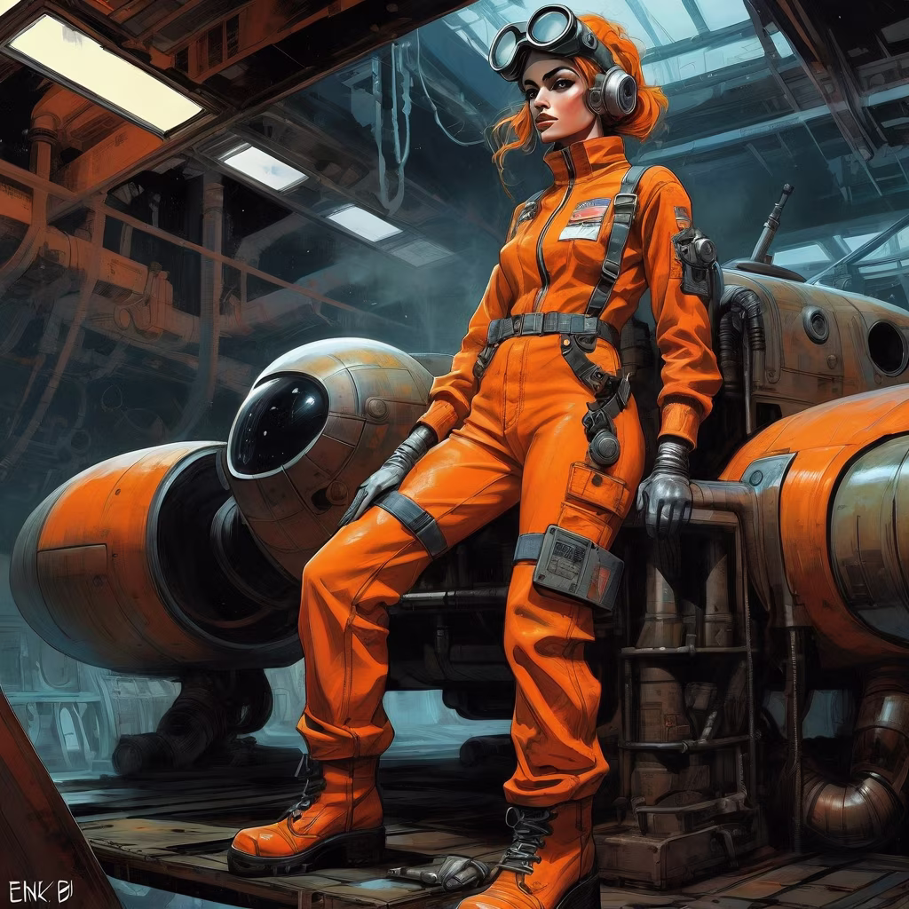 Prompt: space mechanic girl in an orange overall, grease-stained cheeks, mechanic's uniform, by enki bilal and jim mahfood, concept art, sci-fi, atmospheric background, industrial spaceship dock interior, gritty retrofuturistic style, dramatic lighting, detailed workings, tool belt, goggles atop head, worn boots, dynamic 3/4 pose, acrylic digital painting, vivid color palette, 16K fine art portrait.