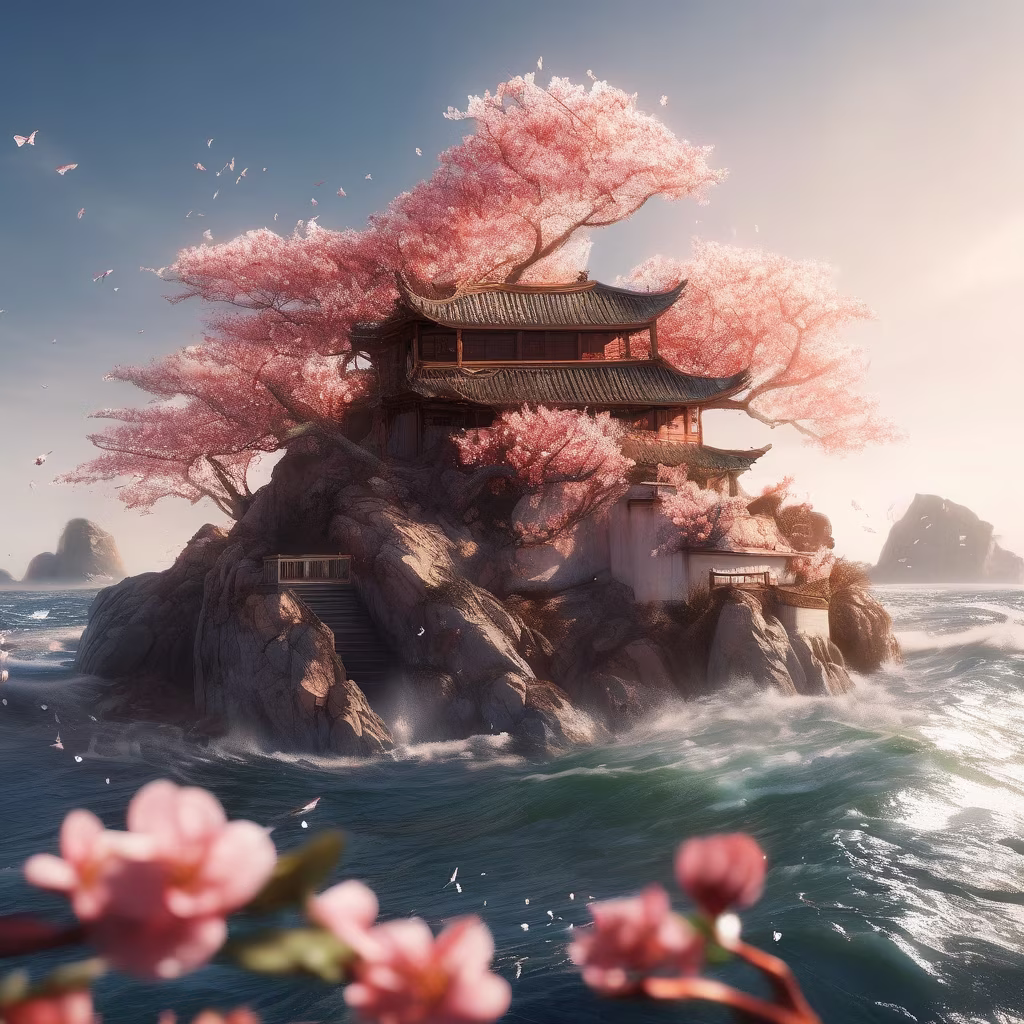 Prompt: Main vision: A huge peach blossom, speeding over the sea. Style: Chinese style, ancient style, fairy tale, mythology. Requirements: stunning sharp focus, ray tracing, epic feeling, gorgeous, ultra-detailed, ultra-clear, cinematic filters, 16k, Leica 50mm prime lens, highly detailed, vray smooth, high-quality 3d rendering, surrealism, masterpiece, Light and shadow, mystery, film and television posters, sense of perspective, sharp, dramatic lighting, epic composition, Hollywood movies, three-dimensional, perspective, film and television blockbusters