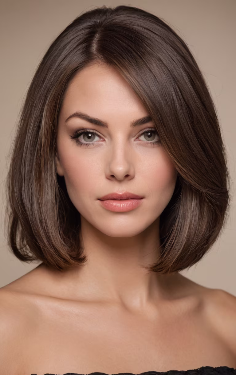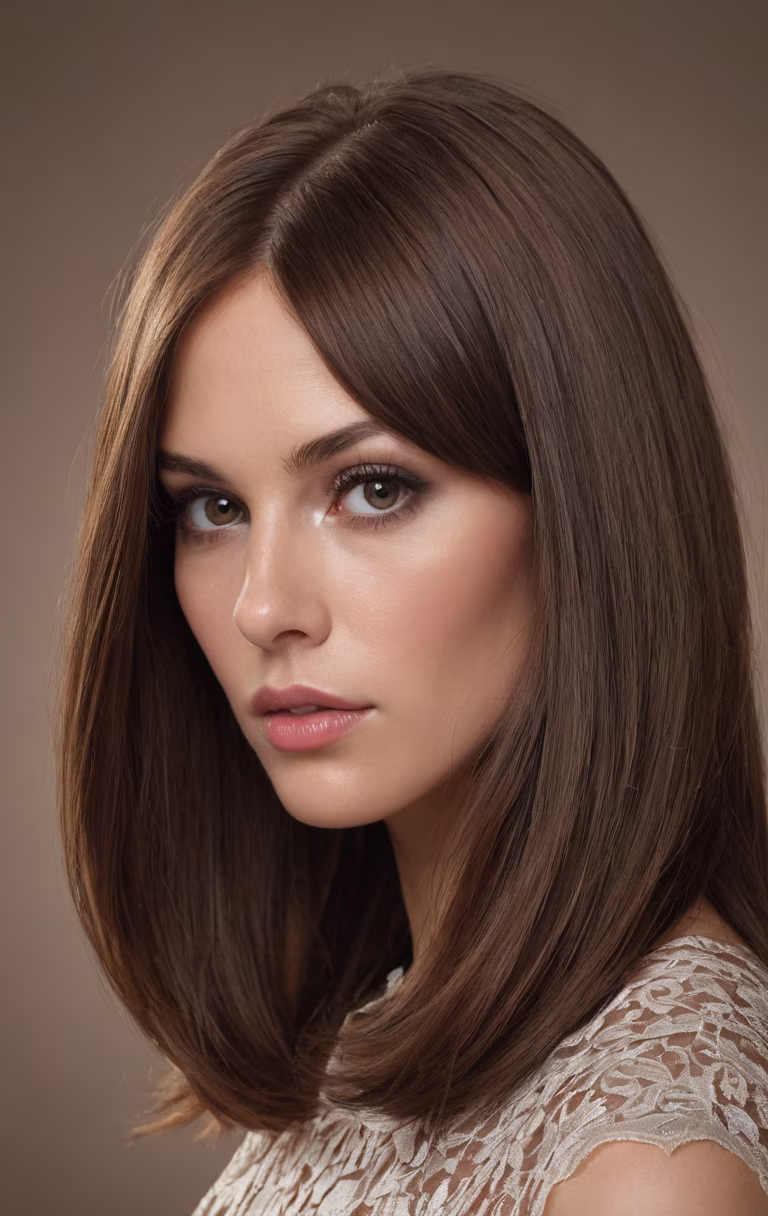 Prompt: Year:1967. Formal portrait. High detail, Canon EOS DSLR photograph. UHD, 8K resolution, sharp focus, full color, formal, in-studio, close up facial shot. Thick, juicy, oversized, swollen puffy lips. Thick, bold eyeliner on upper and lower eyelids. Heavy mascara. Extremely long, luscious, luxuriant, very swollen voluminous hair. Age 40 wife. Her thick, lush, richly textured, very straight brunette hair is expertly styled, precisely arranged, in a very lofty, highly voluminous, full-bodied, puffy, fluffy, billowy, 3D, swollen side-parted chest-length, very long bob with smooth rounded ends. Solid color background. Accurate 1967 styling.