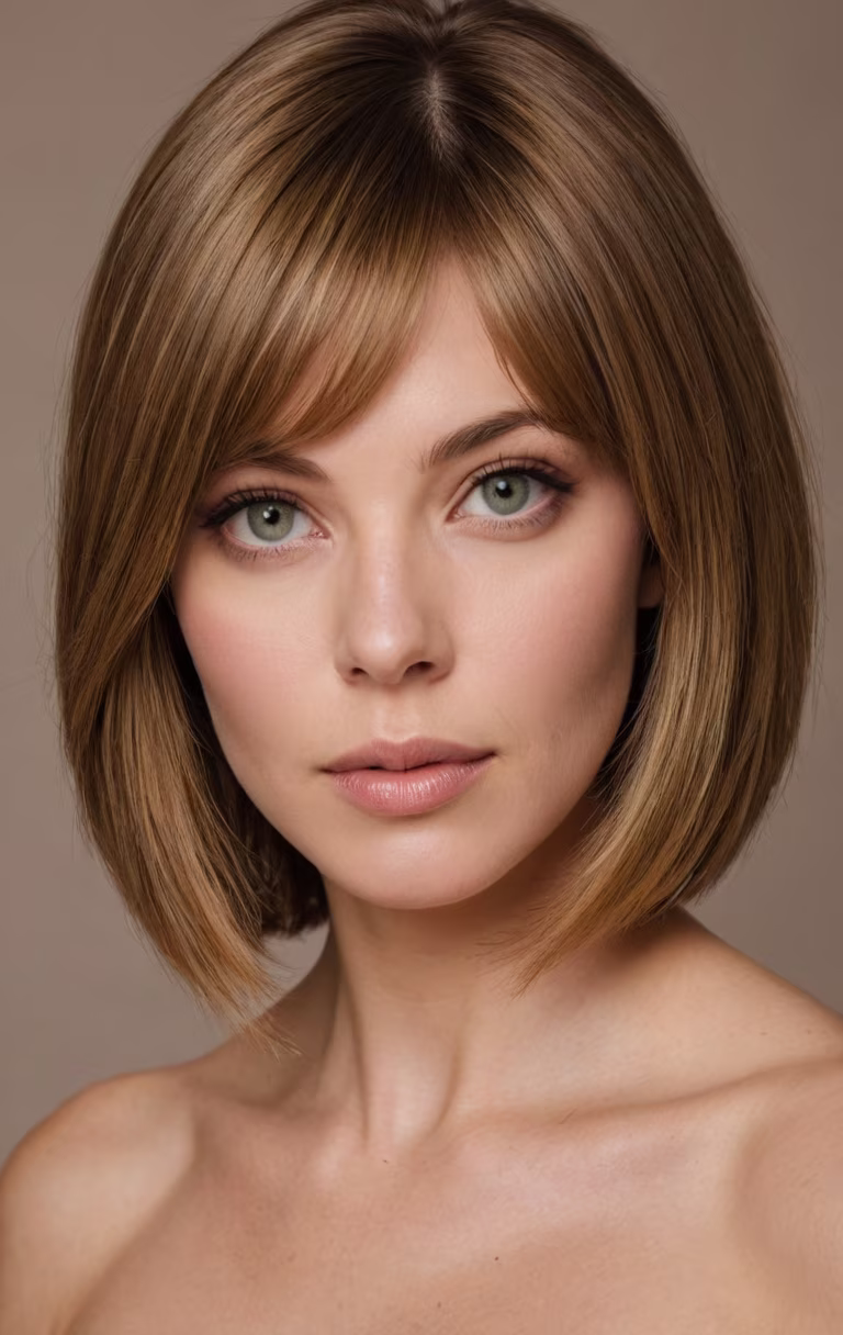 Prompt: Year:1967. Formal portrait. High detail, Canon EOS DSLR photograph. UHD, 8K resolution, sharp focus, full color, formal, in-studio, close up facial shot. Thick, juicy, oversized, swollen puffy lips. Thick, bold eyeliner on upper and lower eyelids. Heavy mascara. Extremely long, luscious, luxuriant, very swollen voluminous hair. Age 40 wife. Her thick, lush, richly textured, very straight auburn hair is expertly styled, precisely arranged, in a very lofty, highly voluminous, full-bodied, puffy, fluffy, billowy, 3D, swollen side-parted long bob with smooth rounded ends. Solid color background. Accurate 1967 styling.