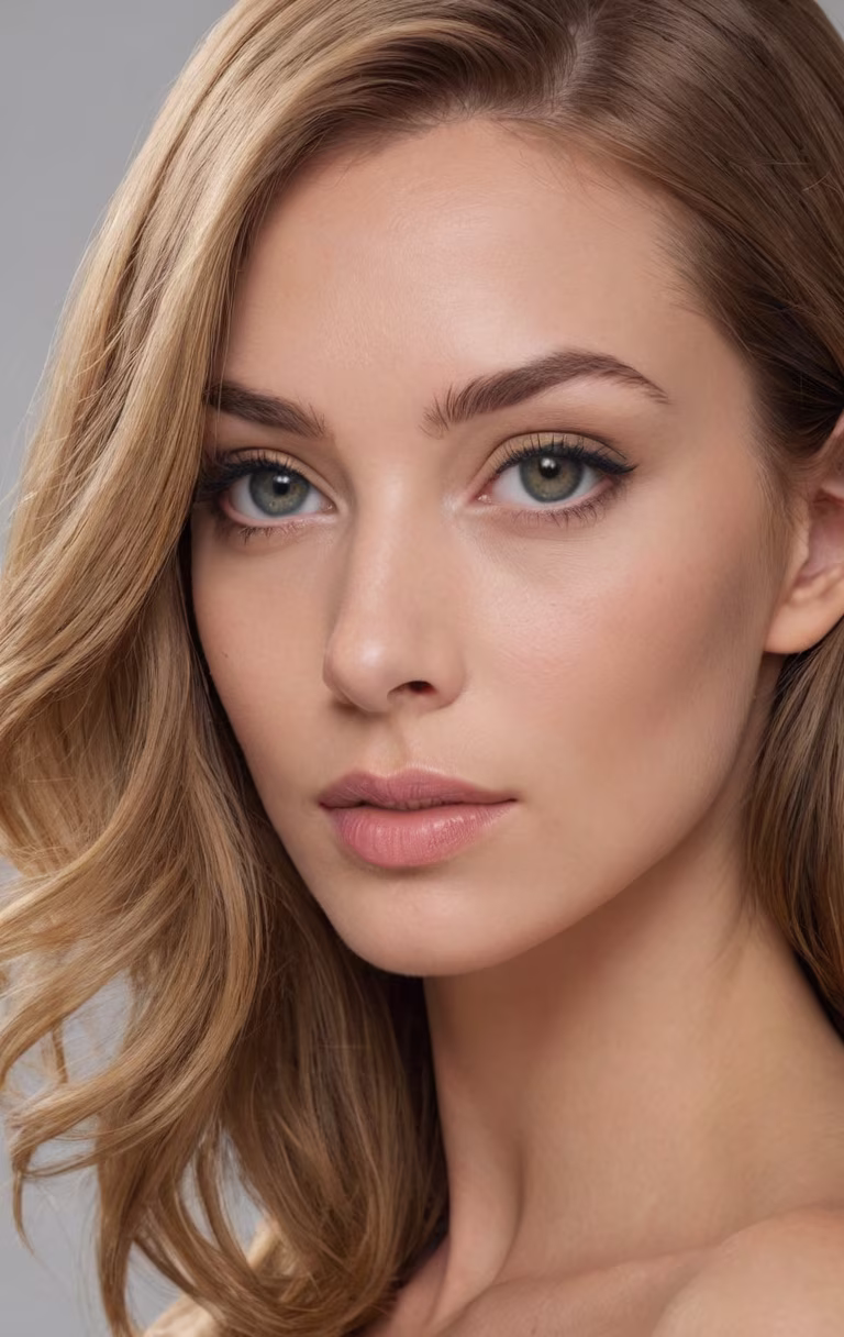 Prompt: Year:1967. Formal portrait. High detail, Canon EOS DSLR photograph. UHD, 8K resolution, sharp focus, full color, formal, in-studio, close up facial shot. Thick, juicy, oversized, swollen puffy lips. Very thick, heavy, bold eyeliner on upper and lower eyelids. Thick, dark, full bodied eyelashes with very heavy bold mascara. Long, luscious, luxuriant, very swollen voluminous hair. Age 40 wife. Her thick, lush, richly textured, very straight bronze hair is expertly styled, precisely arranged, in a very lofty, highly voluminous, full-bodied, puffy, fluffy, billowy, 3D, swollen, very long, flared blunt-cut with smooth rounded ends. Solid color background. Accurate 1967 styling.