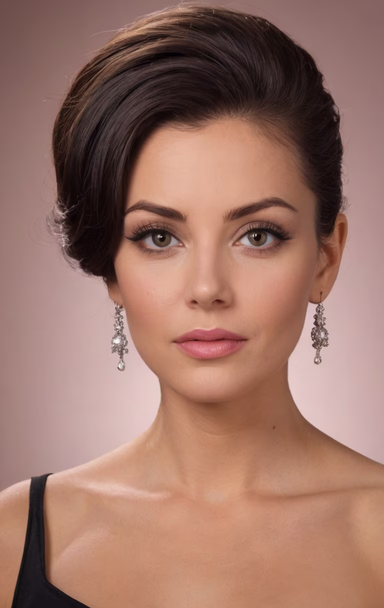Negative: loose tendrils of hair, outdoors, outdoor view, earrings, jewelry, hair beyond camera view, cropped hair, tiara, orange colors, black and white image, nudity, NSFW,