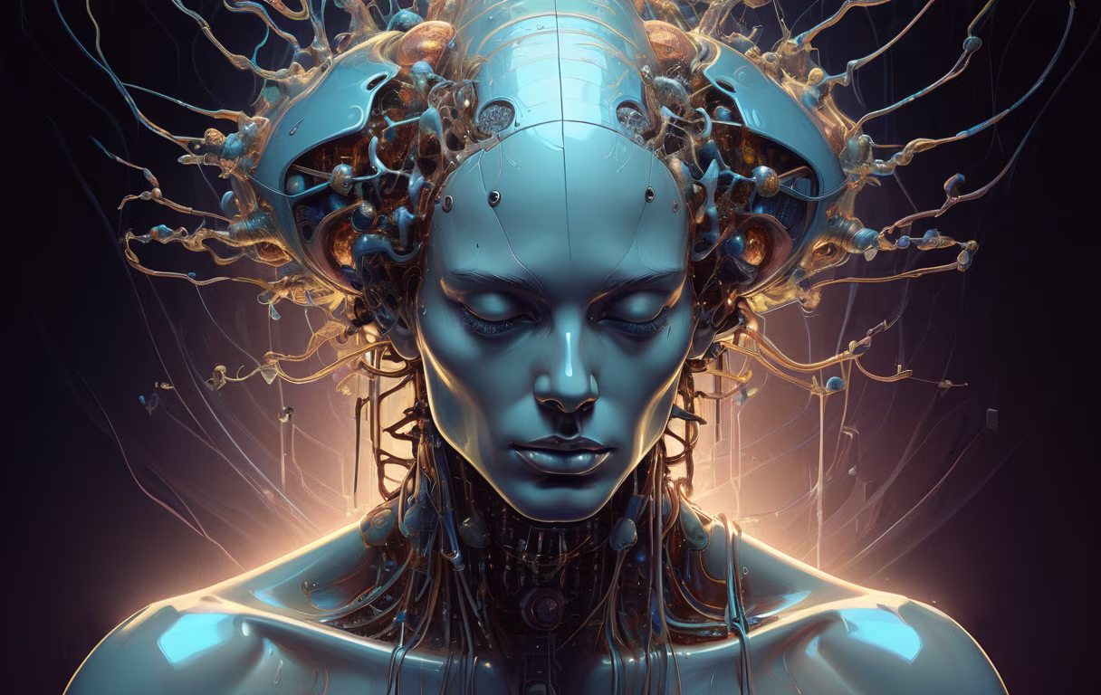 Prompt: shards maketh man, spheres complimentary, exoskeletal indifference, gargantuan concepts, frenetic phrenology, episcopal, eviscerating. fluent liquid flows freely. echo bounces off the wall. an abstract thought in flight. catharsis. an abundance of confusion. cybernetic influentials.(psychedelic lighting, headshot, marc simonetti, maciej kuciara, dynamic, dramatic, santiago caruso)