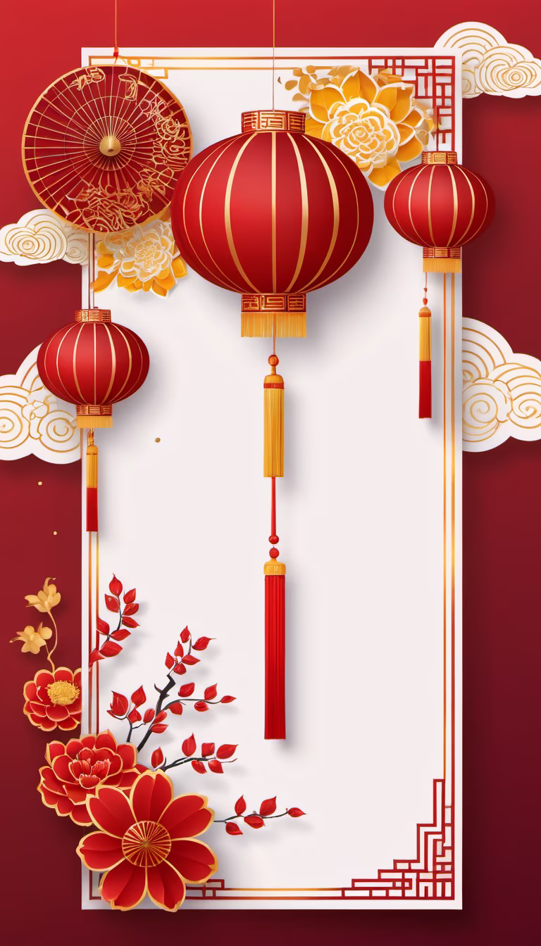 Prompt: a blank vertical banner in red, surrounded by Chinese decorations, lantern, flowers, folding fan, cloud, red, gold, yellow, white background, paper cutting style, complete elements, smooth lighting, seed:4243863587