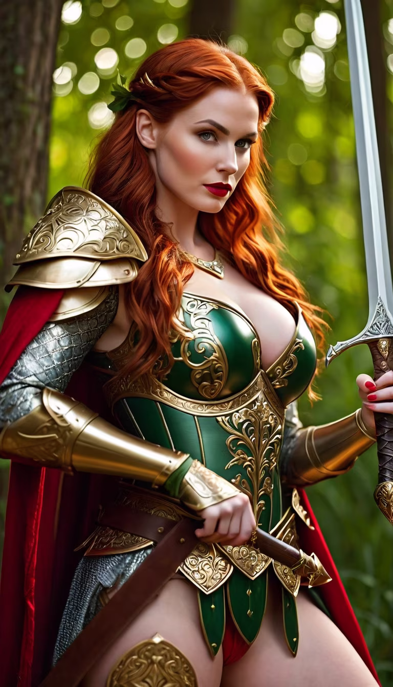Prompt: Pale lady Elf, Paladin, Ample exagerated breasts, Large hips, Strong, Alluring, pale skin, Long auburn hair, low cheekbones, upturned green eyes, Silver armor, red heartshaped lips, Golden patterns, Broadsword,Curvaceous, Voluptuous, Full-figured, Plush, Robust, Ample, Sturdy, alluring