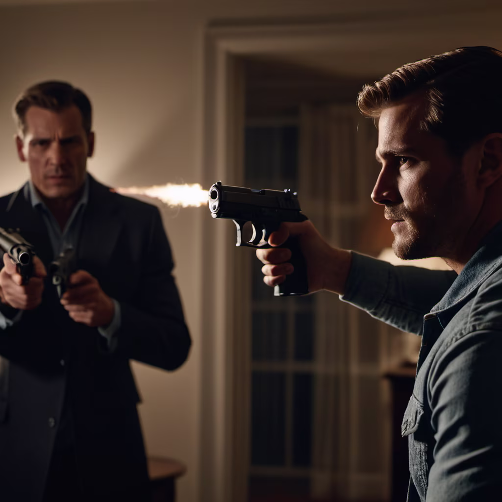 Prompt: A man aiming a gun at another man in a bedroom, cinematic, dark lightning, night, stressful