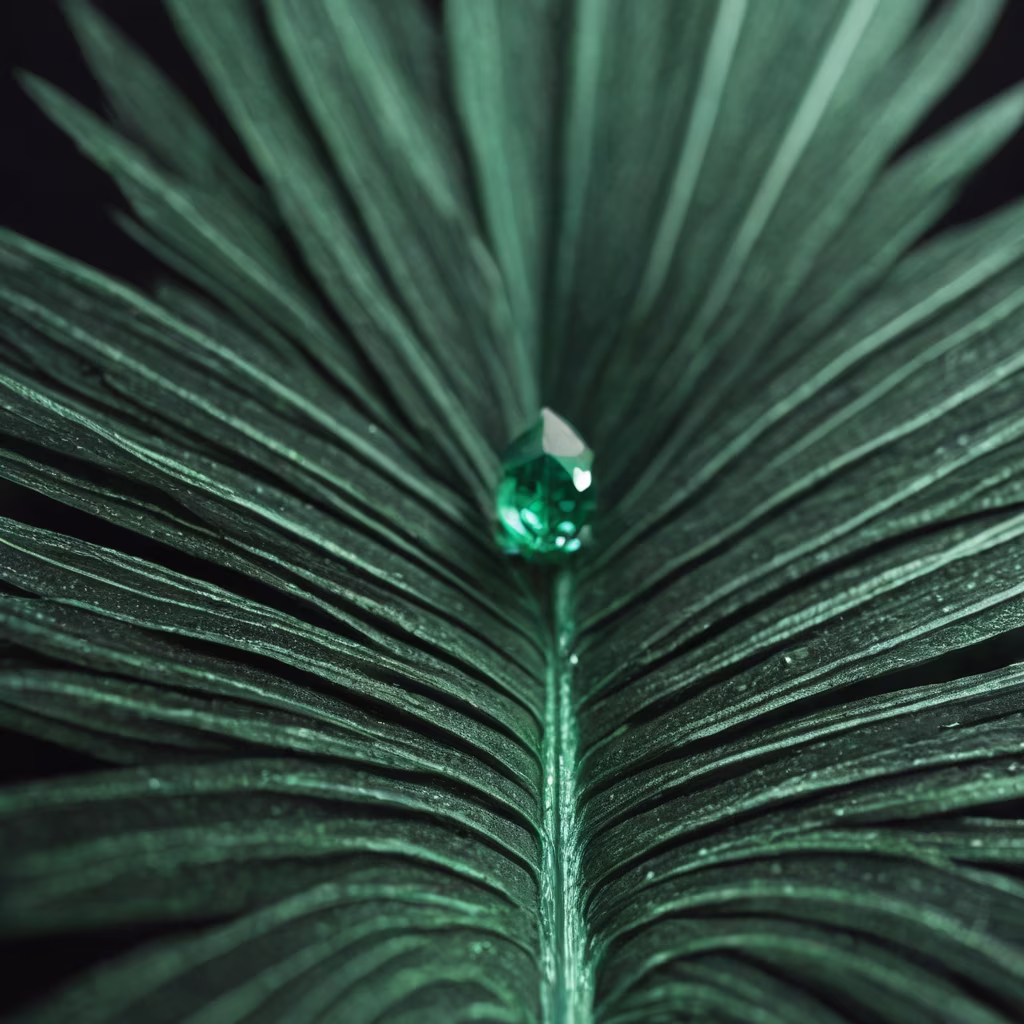 Prompt: An emerald green glowing crystal single leaf, feather, or flower photographed close-up with a macro lens,Opt for emerald green to emphasize the natural form and texture of the subject,Use a soft, blurred background to keep the focus on the main