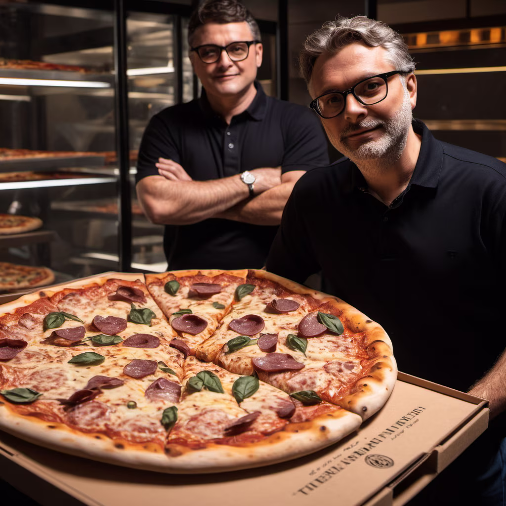 Prompt: an italian man sobbing while sitting at a table in a restaurant, a pizza with pineapple slices on it lies on the table