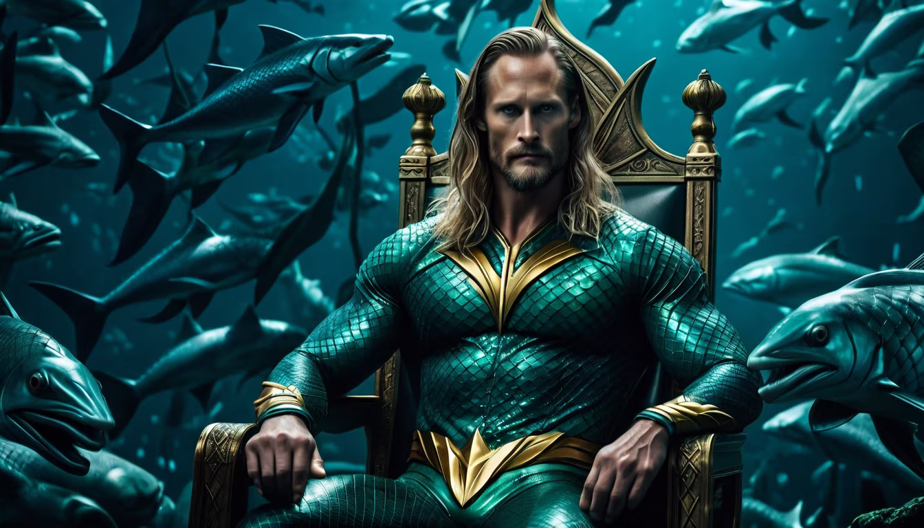Prompt: Alexander Skarsgård as Aquaman. Sitting in throne. torso. uhd, 16k, atmospheric lighting, ultra-detailed, photorealistic, photorealism.