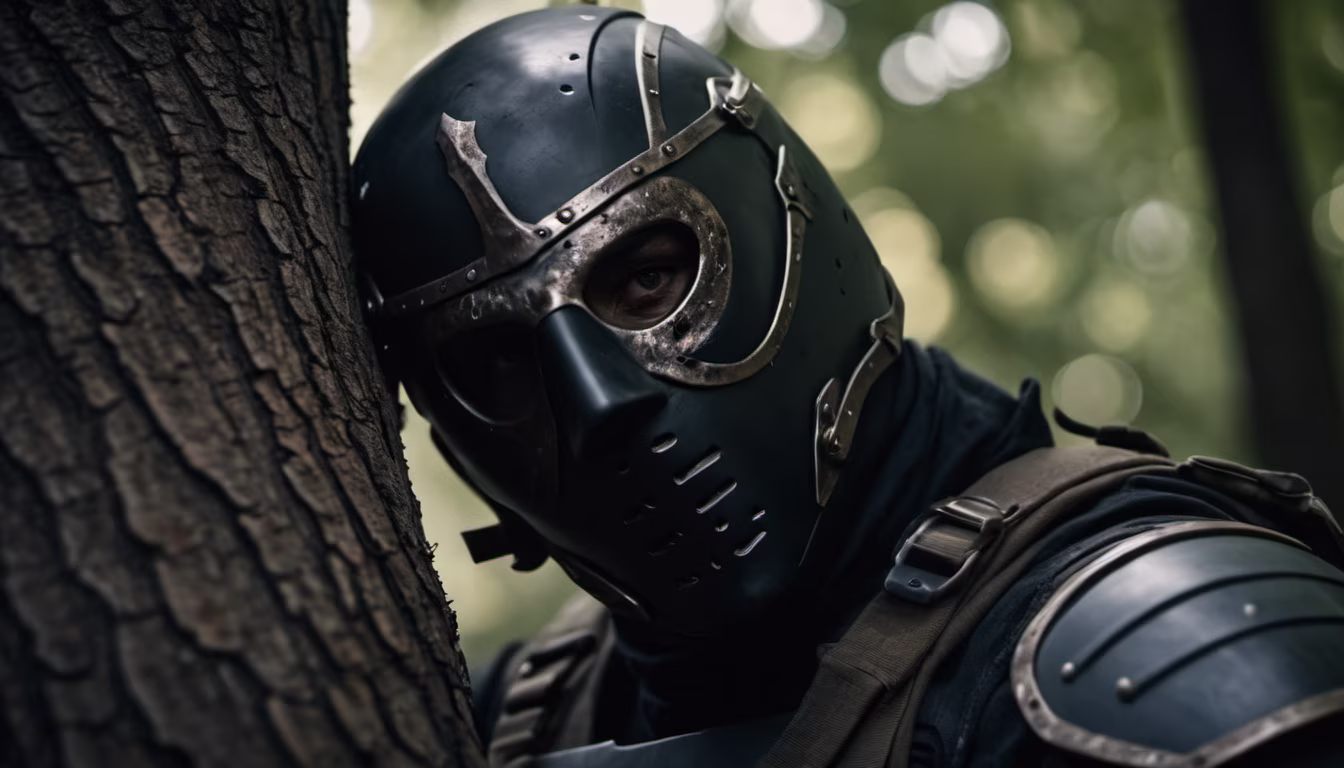 Prompt: a soldier in a dark cyberpunk mask, sci fi armor, is severely wounded, lying leaning against a tree trunk