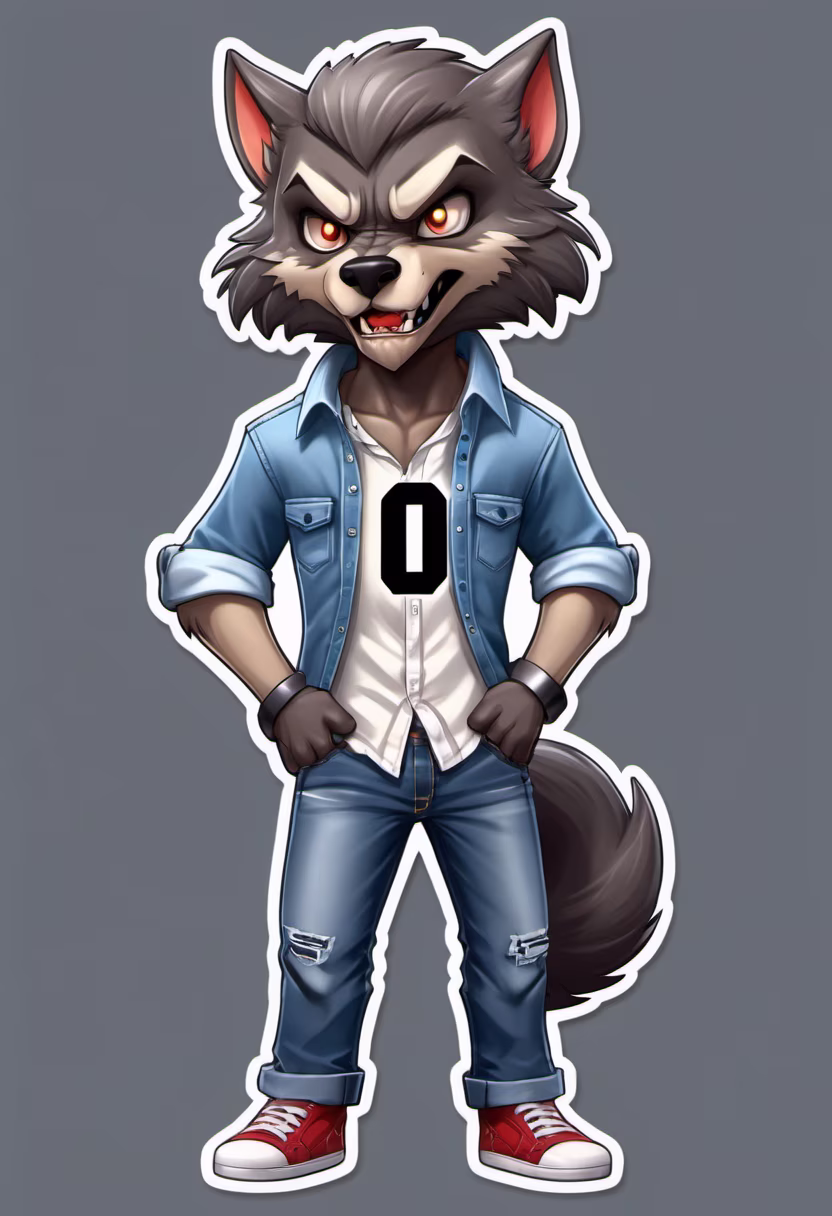 Prompt: Chibi werewolf wearing a shirt that says the word in bold block letters ((TEN:1.10)) and jeans, full body, 3d sticker, anthropomorphic, artgerm, DeviantArt, no background, no borders, no doubles